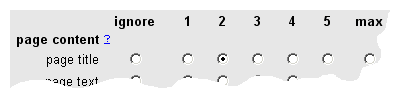 For each part of the page you can choose from a number of values running from "ignore" to "max". This controls the weighting or importance of each part of your HTML page.
